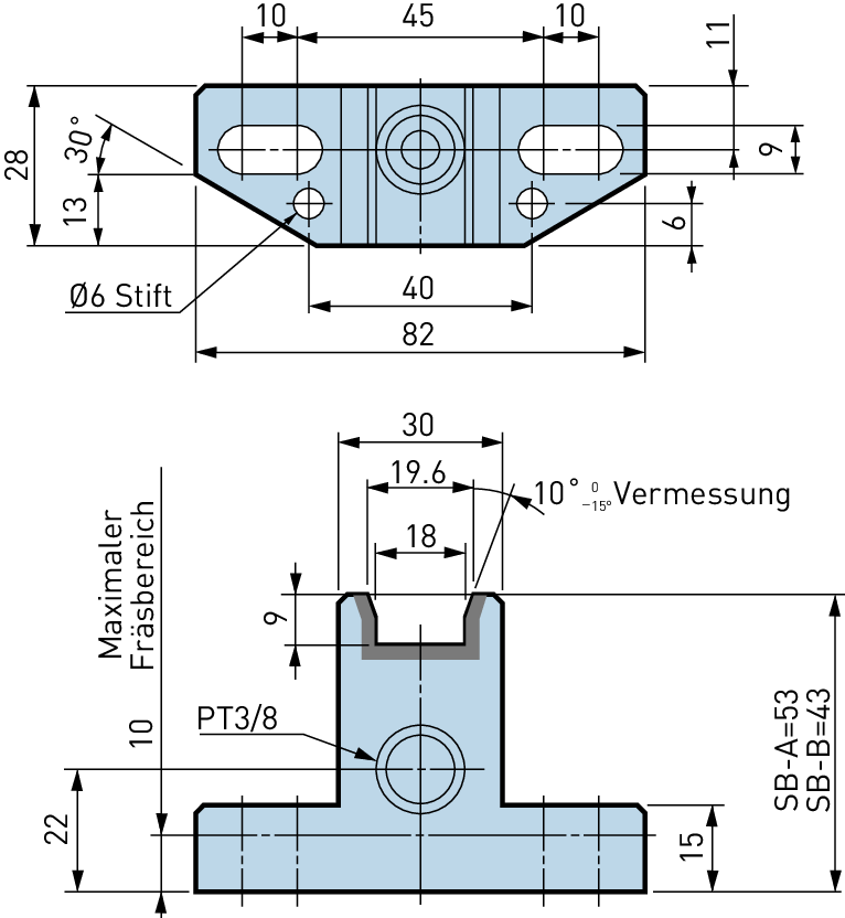 Ein halbfertiger Stoppblock kann durch Abfräsen des überschüssigen Materials auf gewünschte Höhe gebracht werden. Wenn der vorgefertigte Stoppblock vom Hersteller nicht erhältlich ist, kann ein halbfertiger Stoppblock benutzt werden. Bitte konsultieren Sie den Maschinenhersteller für die Auswahl, Bearbeitung und Montage eines halbfertigen Blocks.