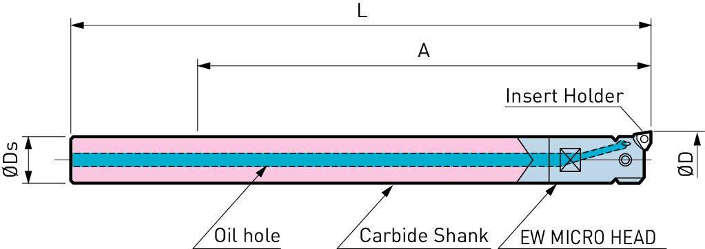 These heads are designed to be used in combination with carbide bars Ø 14 and Ø 16 mm from the accessory program. In conjunction with the long carbide bar, the tool is well suited for vibration-free finishing operations in bores with unfavorable Ø/L-ratios.