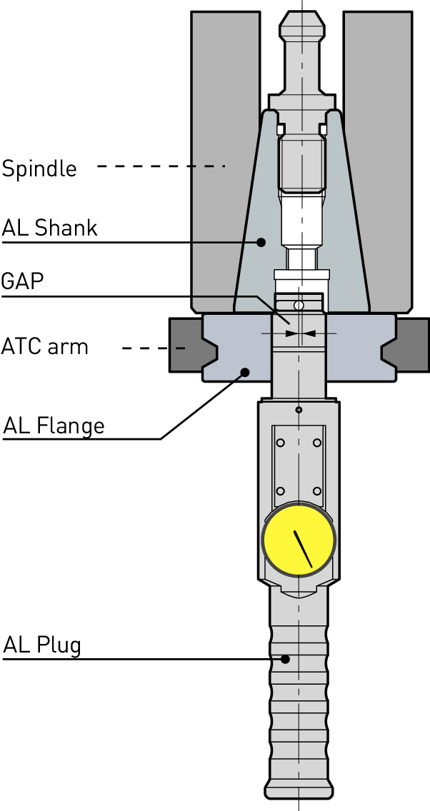 For maintenance of machine tool spindles. Equipment to measure misalignment between the ATC arm and machine tool spindle or magazine pot center.