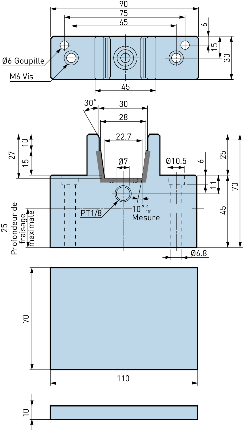 Un Stop Bloc semi-fini possède une forme de sillon adaptée à une utilisation avec un module d’angle et présente un excès de matière permettant à l’utilisateur de fraiser le Bloc à la hauteur qu’il souhaite. Lorsqu’il n’est pas possible de se procurer un Stop Bloc fini chez le fabricant de la machine-outil, il est possible d’utiliser un Stop Bloc semifini. Veuillez consulter le fabricant de la machine-outil pour la sélection, le traitement et l’assemblage d’un Stop Bloc semi-fini.